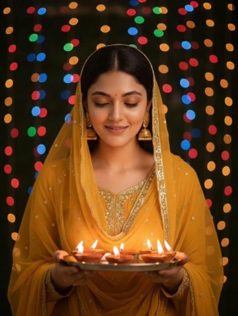 USE UPLOADED PHOTO AS REFRENCE FOR FACE AND KEEP THE FACE AND FACIAL FEATURES EXACTLY THE SAME DONT CHANGE ANY THING. A DREAMY, PHOTOREALISTIC PORTRAIT OF A YOUNG WOMAN WITH A SERENE EXPRESSION, LOOKING DOWN WITH CLOSED EYES. SHE IS WEARING A YELLOW AND GOLD INDIAN SALWAR SUIT WITH A SHEER DUPATTA AND LARGE JHUMKA EARRINGS. SHE HOLDS A THALI (PLATE) WITH BEAUTIFULLY LIT YELLOW DIYAS. THE BACKGROUND IS A MAGICA OUT-OF-FOCUS WALL OF VIBRANT. COLORFUL FESTIVE BOKEH LIGHTS AT NIGHT. THE PRIMARY LI SOURCE IS THE SOFT, WARM GLOW FROM THE DIYAS SHE IS HOLDING, ILLUMINATING HER FAC BEAUTIFULLY.