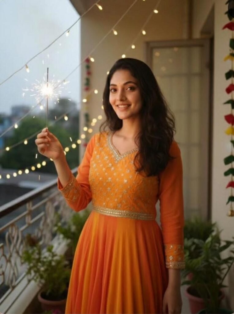 USE UPLOADED PHOTO AS REFRENCE FOR FACE AND KEEP THE FACE AND FACIAL FEATURES EXACTLY THE SAME DONT CHANGE ANY THING. A VIBRANT, PHOTOREALISTIC PORTRAIT OF A YOUNG WOMAN SMILING WARMLY AT THE CAMERA. SHE WEARS A FESTIVE ORANGE AND YELLOW ANARKALI-STYLE DRESS WITH SILVER TRIM. SHE IS HOLDING UP A SINGLE LIT SPARKLER IN HER RIGHT HAND. THE BACKGROUND IS AN OUTDOOR BALCONY AT NIGHT, DECORATED WITH DIAGO STRINGS OF WARM FAIRY LIGHTS AND TRADITIONAL INDIAN FESTIVE HANGINGS (TORANS), CREAT A CHEERFUL AND CELEBRATORY ATMOSPHERE.