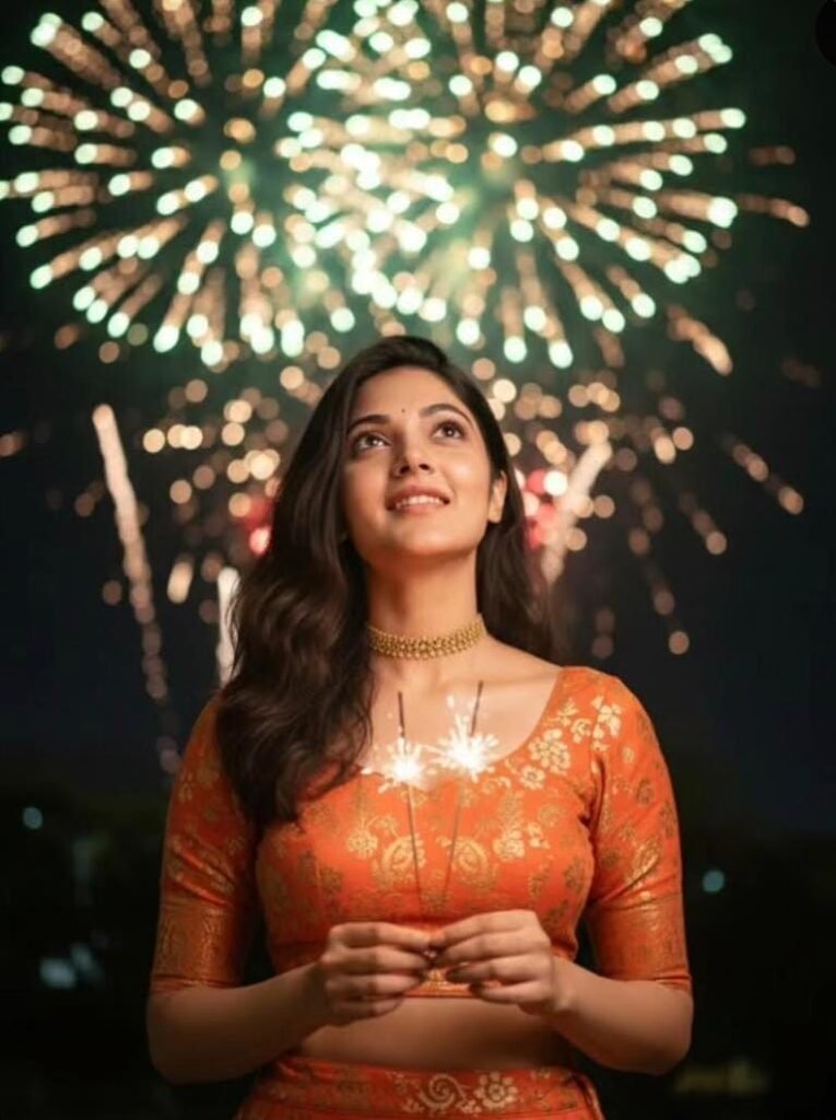 USE UPLOADED PHOTO AS REFRENCE FOR FACE AND KEEP THE FACE AND FACIAL FEATURES EXACTLY THE SAME DONT CHANGE ANY THING. A MAGICAL, PHOTOREALISTIC PORTRAIT OF A YOUNG WOMAN LOOKING UP WITH A GENTLE, SMILING EXPRESSION OF AWE. SHE IS WEARING AN ORANGE AND GOLD PATTERNED CROP TOP AND SKIRT LEHENGA. WITH A SIMPLE GOLD CHOKER NECKLACE. SHE HOLDS TWO UNLIT SPARKLERS. THE NIGHT SKY BEHIND HER IS FILLED WITH BEAUTIFUL, OUT-OF-FOCUS BOKEH OF BURSTING FIREWORKS, WITH STREAKS OF GREEN AND GOLD LIGHT, CREATING A WONDROUS AND CELEBRATORY MOOD