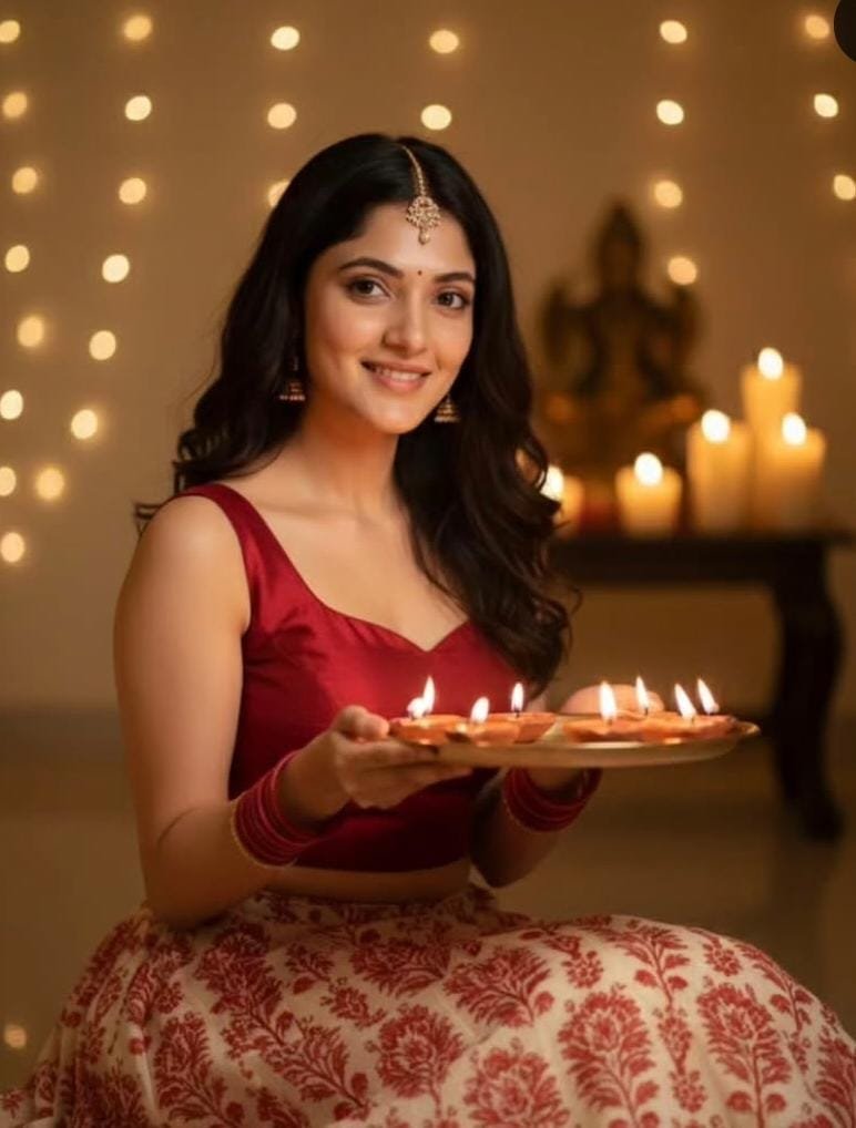 USE UPLOADED PHOTO AS REFRENCE FOR FACE AND KEEP THE FACE AND FACIAL FEATURES EXACTLY THE SAME DONT CHANGE ANY THING. A TRADITIONAL, PHOTOREALISTIC PORTRAIT OF A YOUNG WOMAN SITTING GRACEFULLY. SHE WEARS A SLEEVELESS RED BLOUSE AND A CREAM- COLORED LEHENGA SKIRT WITH A BOLD RED FLORAL PRINT, ALONG WITH A MAANG TIKKA AND NUMEROUS RED BANGLES. SHE IS SMILING WARMLY AT THE CAMERA WHILE HOLDING A BRASS TH OF LIT DIYAS. THE BACKGROUND IS RICHLY DECORATED WITH WARM STRING LIGHTS AND BLUR CANDLES, WITH A HINT OF A DEITY STATUE, CREATING A WARM, FESTIVE, AND INVITING INDOOSETTING.