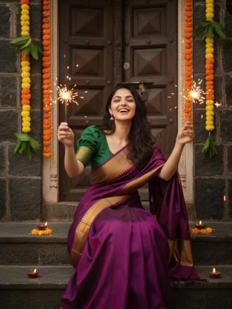 USE UPLOADED PHOTO AS REFRENCE FOR FACE AND KEEP THE FACE AND FACIAL FEATURES EXACTLY THE SAME DONT CHANGE ANY THING. A JOYFUL, PHOTOREALISTIC SHOT OF A WOMAN CELEBRATING IN A TRADITIONAL INDIAN HOME. SHE IS DRESSED IN A RICH PURPLE SILK SAREE WITH A GOLD BORDER AND A CONTRASTING GREEN PUFF-SLEEVE BLOUSE (TRADITIONAL MAHARASHTRIAN STYLE). SHE IS SITTING ON THE STEPS. LAUGHING EXUBERANTLY WHILE HOLDI TWO LIT SPARKLERS. THE BACKGROUND FEATURES TURES AUTHENTIC DETAILS LIKE DARK STONE WALLS ORNATE DARK WOOD DOOR, AND FESTIVE MARIGOLD FLOWER GARLANDS, CREATING A SCENE AUTHENTIC, HAPPY CELEBRATION."