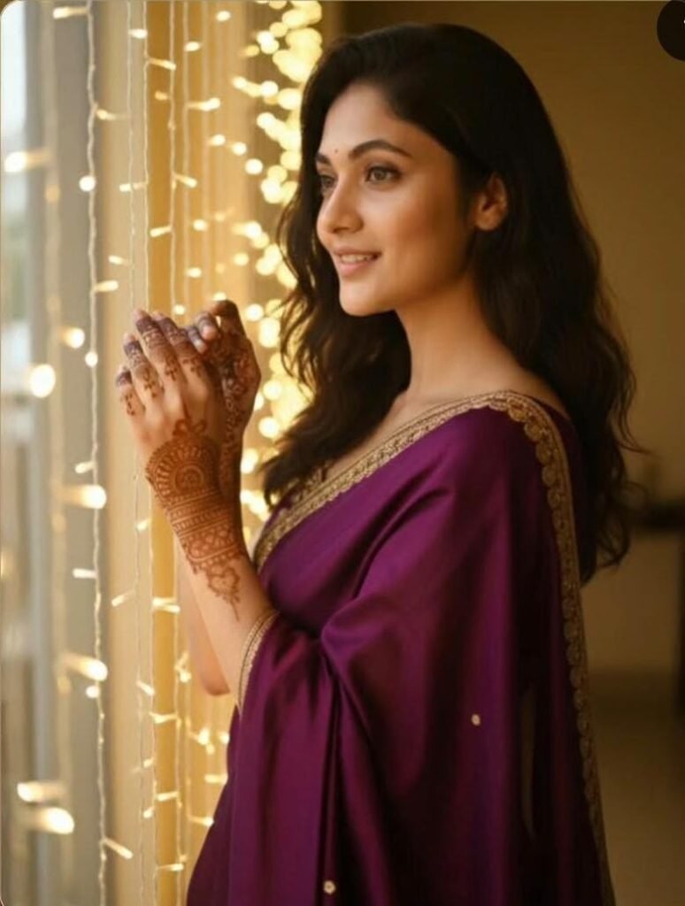 USE UPLOADED PHOTO AS REFRENCE FOR FACE AND KEEP THE FACE AND FACIAL FEATURES EXACTLY THE SAME DONT CHANGE ANY THING. AN ELEGANT, PHOTOREALISTIC PORTRAIT OF A YOUNG WOMAN IN A SIDE PROFILE. SHE IS WEARING A RICH, DEEP PURPLE DRESS OR SAREE AND HAS INTRICATE HENNA (MEHNDI) DESIGNS ON HER HANDS. SHE STANDS AMIDST CASCADING CURTAINS OF WARM. GOLDEN STRING LIGHTS. WHICH CREATE A STRONG. MAGICAL BOKEH EFFECT ALL AROL HER. HER POSE IS GRACEFUL AND SERENE, AND THE LIGHTING IS SOFT AND ATMOSPHERT CREATING A DREAMY AND SOPHISTICATED MOOD.