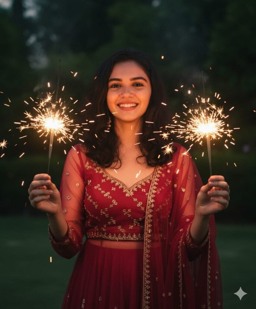 USE UPLOADED PHOTO AS REFRENCE FOR FACE AND KEEP THE FACE AND FACIAL FEATURES EXACTLY THE SAME DONT CHANGE ANY THING. A CANDID, PHOTOREALISTIC SHOT OF A YOUNG WOMAN WITH A JOYFUL, BRIGHT SMILE, CELEBRATING AT NIGHT. SHE IS DRESSED IN A SHEER, DEEP RED INDIAN OUTFIT. SHE HOLDS TWO BRIGHT, LIT SPARKLERS, ONE IN EACH HAND. WHICH ILLUMINATE HER AND THE IMMEDIATE SURROUNDINGS WITH A SHOWER OF GOLDEN SPARKS. BACKGROUND IS DARK AND NATURAL, WITH HINTS OF OUTDOOR FOLIAGE. MAKING THE LIGHT FE THE SPARKLERS THE CENTRAL FOCUS.