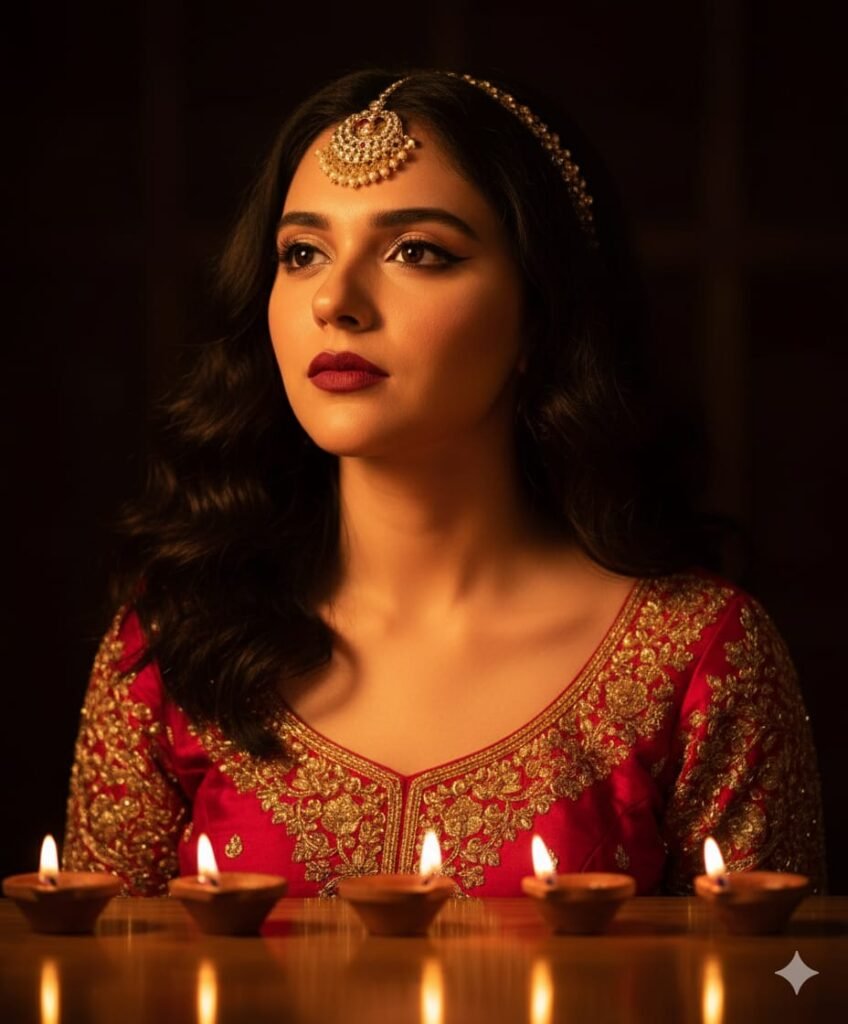 USE UPLOADED PHOTO AS REFRENCE FOR FACE AND KEEP THE FACE AND FACIAL FEATURES EXACTLY THE SAME DONT CHANGE ANY THING. A PHOTOREALISTIC, MOODY PORTRAIT OF A YOUNG INDIAN WOMAN WITH DRAMATIC. GLAMOROUS MAKEUP. INCLUDING BOLD EYELINER AND A MAANG TIKKA ON HER FOREHEAD. SHE IS WEARING A RICH RED AND GOLD EMBROIDERED BLOUSE. SHE LOOKS UP AND TO THE SIDE WITH A SERENE EXPRESSION. THE SCENE IS LIT ENTIRELY BY THE WARM. INTENSE GOLDEN GLOW F ROW OF LIT CLAY DIYAS (OIL LAMPS) PLACED ON A REFLECTIVE SURFACE IN FRONT OF HER, CAS STRONG HIGHLIGHTS AND DEEP SHADOWS ON HER FACE AND CREATING A POWERFUL, DEVOTIONALATMOSPHERE."