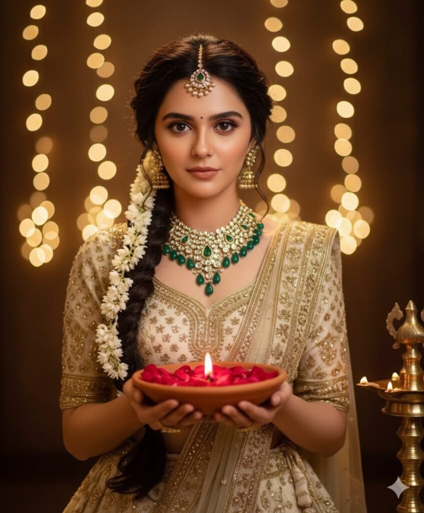 USE UPLOADED PHOTO AS REFRENCE FOR FACE AND KEEP THE FACE AND FACIAL FEATURES EXACTLY THE SAME DONT CHANGE ANY THING. GENERATE A PHOTOREALISTIC, ELEGANT PORTRAIT OF A YOUNG INDIAN WOMAN LOOKING DIRECTLY AT THE CAMERA WITH A CALM EXPRESSION. SHE WEARS A LUXURIOUS CREAM AND GOLD EMBROIDERED LEHENGA, A HEAVY KUNDAN NECKLACE WITH GREEN GEMS, AND A MATCHING MAANG TIKKA. HER DARK HAIR IS STYLED IN A LONG BRAID ADOR WITH WHITE JASMINE FLOWERS (GAJRA). SHE IS HOLDING A CLAY BOWL FILLED WITH RED FLO PETALS AND A SINGLE LIT FLAME. THE BACKGROUND IS WARM AND SOFTLY LIT WITH BOKEH LIGHTS FEATURING A TRADITIONAL BRASS OIL LAMP (SAMAI) ON THE RIGHT