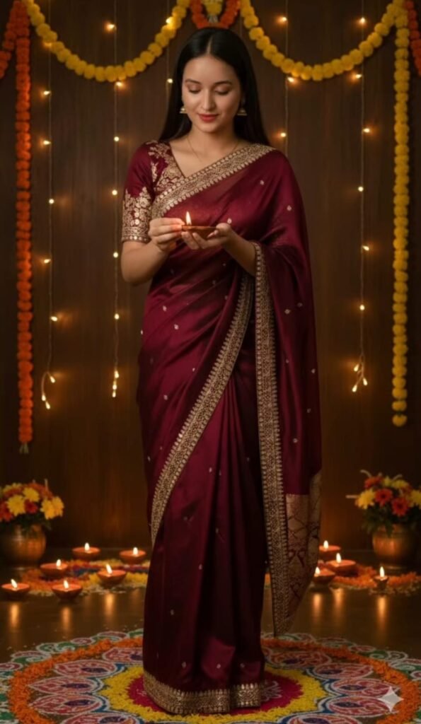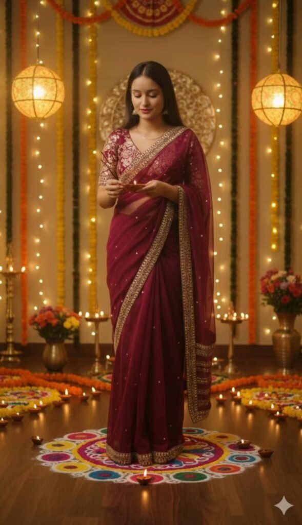 "Ultra realistic 4K HD Diwali festival scene, a beautiful young woman in a traditional elegant saree, standing andlighting an earthen diya lamp. Her face must remain exactly the same as in the reference photo, no face change.Background decorated with glowing diyas, rangoli, fairy lights, and festive flowers. Warm golden lighting,cinematic look, sharp details, natural skin tone, high quality, realistic atmosphere .