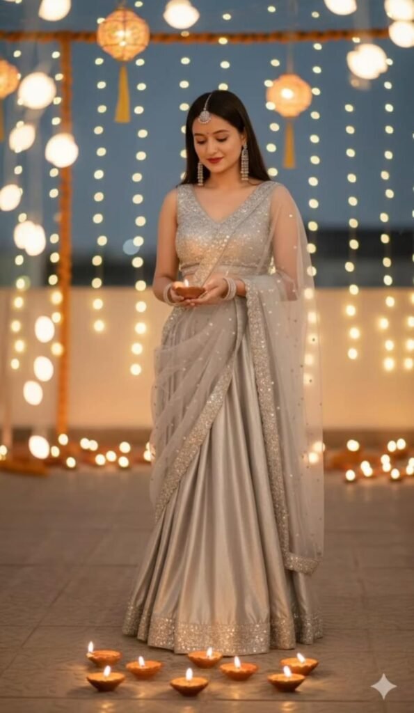 4k picture of a young Indian woman standing a top wearing a lehenga in shades silver and sleeveless v nack blouse and silver lehenga with net duppata and matching bangles and earrings and mangtika,her. A creamy and gentle bokeh effect of light lamps and flare lights is reflected in the background, defferent style The rooftop diyas are being illuminated.