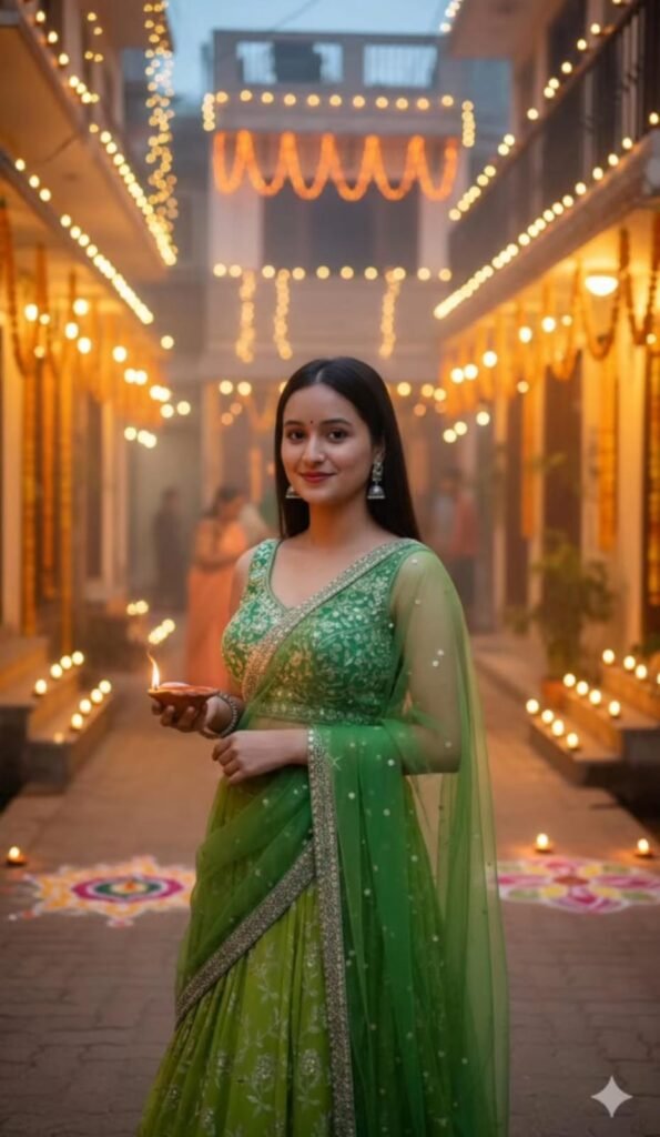 Ultra realistic 4K HD Diwalifestival scene in Sehore (India), a beautiful young woman wearing a green colour mordan lehenga, lighting an earthen diya lamp. Her face must remain exactly the same as in the reference photo, noface change. Background isoutdoor in Sehore style decorated houses with glowing diyas, fairy lights, rangoliat the doorstep, flower garlands, and festive atmosphere of small townstreets. Warm golden lighting, natural skin tone, cinematic look, high quality, realistic festiveenvironment."