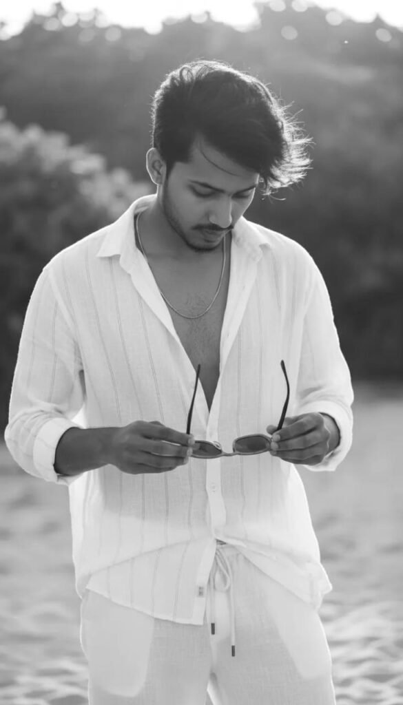 A stylish, medium-shot outdoor portrait of a young man (from uploaded image) with dark, windswept hair and a light beard, looking down and adjusting a pair of sunglasses held in his hand. He is dressed in a monochrome, loose-fitting outfit: an open, striped white linen shirt and matching white linen drawstring trousers. He wears a thin gold chain necklace visible on his bare chest.