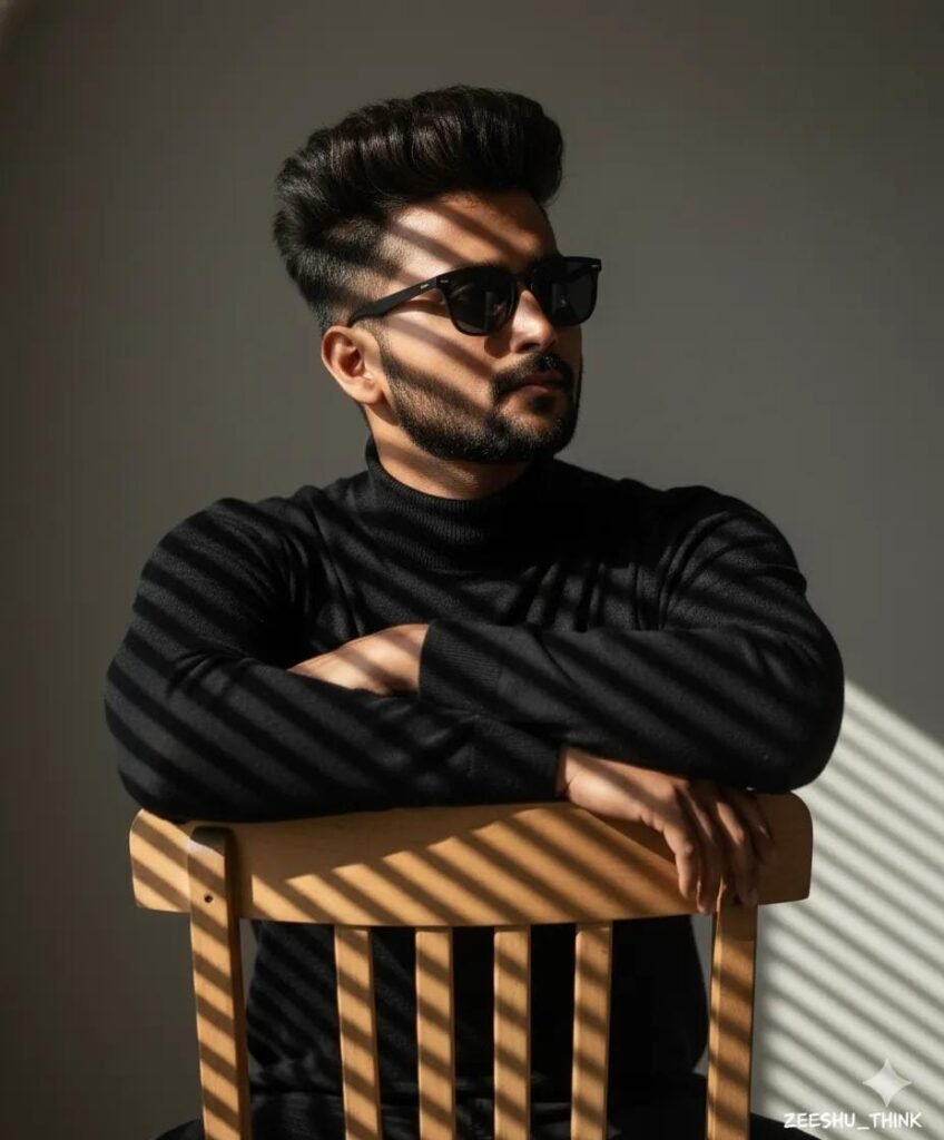 Ultra-detailed 8K cinematic portrait of a man sitting on a wooden chair, arms crossed over the chair backrest, his head slightly tilted. He wears a black turtleneck and stylish sun-glasses. Strong directional light enters through venetian blinds, casting dramatic shadow lines across his face, body, and background wall. The composition is minimalist, with a dark neutral background and geometric light patterns.