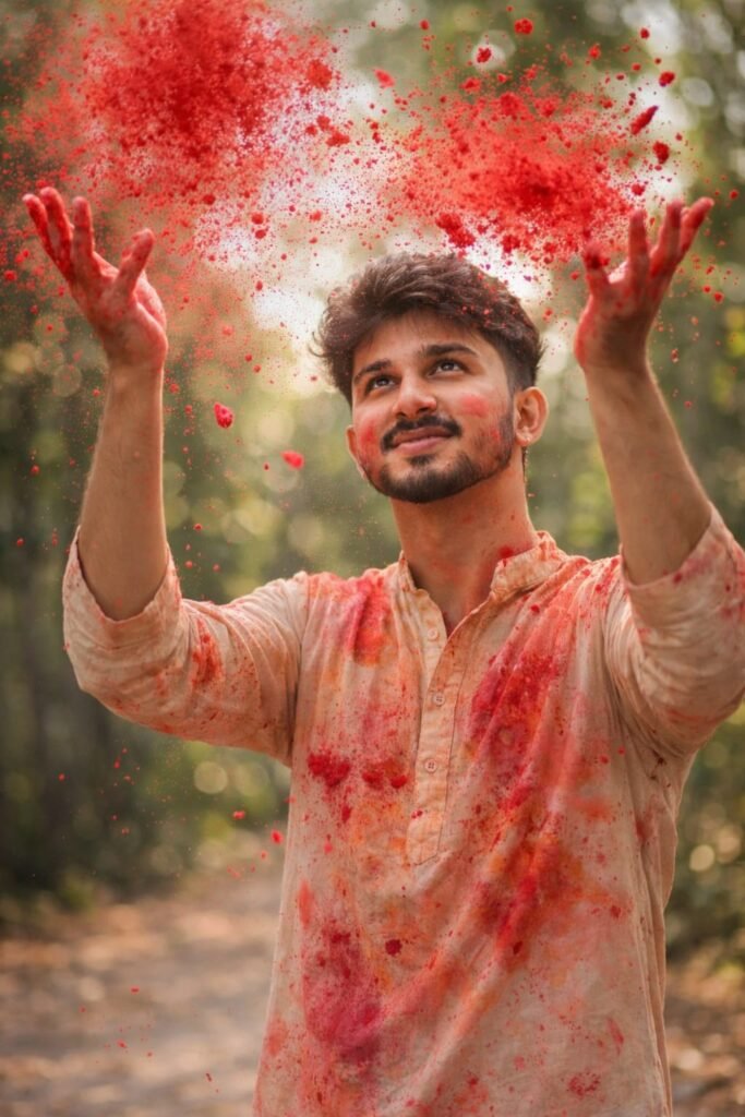 A young Indian man celebrating Holi, tossing bright red color powder (red gulal) into the air with both hands. He is wearing a stylish light beige kurta splashed with red color, smiling softly and looking upward. Red gulal particles frozen mid-air around his face, creating a dramatic dynamic splash effect Natural outdoor background with trees and soft blur (bokeh). Bright daylight, cinematic lighting, shallow depth of field. Realistic skin texture, expressive eyes, joyful festive mood.