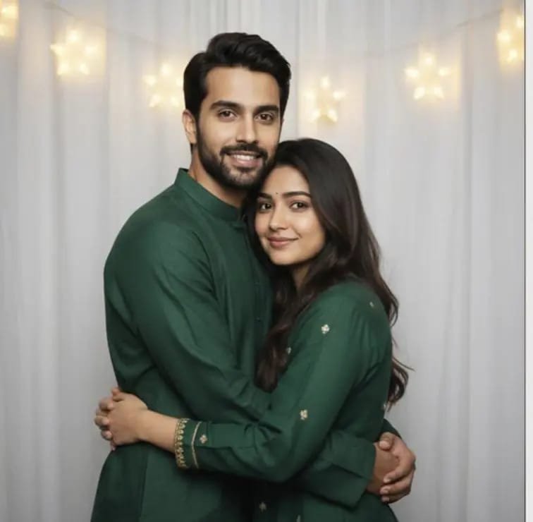 A hyper-realistic 8K cinematic DSLR double exposure portrait of a couple. Use the exact faces from the reference photo, do not alter their faces in any way. The primary close-up shows the couple forehead to forehead, eyes closed, in a soft romantic embrace. The man has a beard and wears a black patterned sherwani jacket, while the woman wears a black outfit with elegant bangles. Her hand rests on his chest, highlighting a wristwatch. The secondary exposure shows both of themstanding #couple