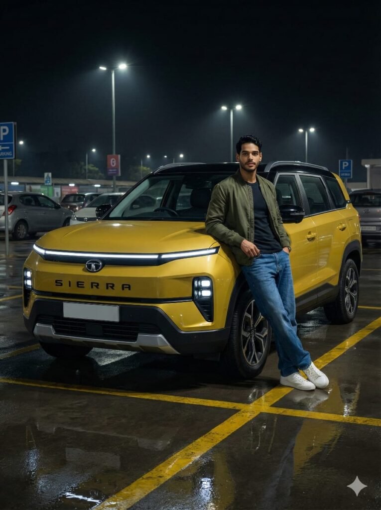 Hyperrealistic Indian mall-parking portrait. Face locked cked exactly. Full-body framing. Pose locked to reference: subject leaning casually against the front fender of the car, arms relaxed, one leg crossed over the other, body weid weight on the supporting leg. Maintain identical pose geometry, stance, and limb angles.A yellow Tata Sierra 2025. Enforce real 2025 Sierra proportions: Iong-wheelbase SUV stance, upright cabin, wide flat bonnet, continuous full-width LED bar, centered Tata logo, rectangular DRL modules, deep lower bumper with silver skid plate, black roof, sharp shoulder line, large alloys, S I E R R A lettering on the front fascia. No rounded compact-SUV substitutes. No old Sierra shape.Angle: three-quarter front with the entire front fascia visible-LED bar, grille zone, bumper architecture, both front wheels, and a clean view of the yellow body.Outfit: fitted T-shirt, lightweight bomber jacket, relaxed jeans, white sneakers. Keep identical lighting interaction on fabric and shoes as the reference stance.Environment: Indian parking zone at night with overhead lamps, damp reflective ground, yellow lane markings, subtle signage. Maintain clean cinematic shadows, accurate reflections on the car's yellow paint and glass. Zero stylizationFrequently Asked Questions (FAQs) About Tata Sierra